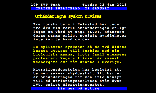 Idag gör mamman texttvdebut. Ebban och pappan är stolta!! Hela inslaget: http://www.svt.se/nyheter/regionalt/vastnytt/vanvardade-barn-utvisas-syskonen-splittras Inläggsförfattare:erik Inlägget publicerat:januari 22, 2013, 12:54 Inläggskategori:Uncategorized Kommentarer på inlägget:1 kommentar Fortsätt läsaIdag gör mamman texttvdebut. Ebban och pappan är stolta!!
