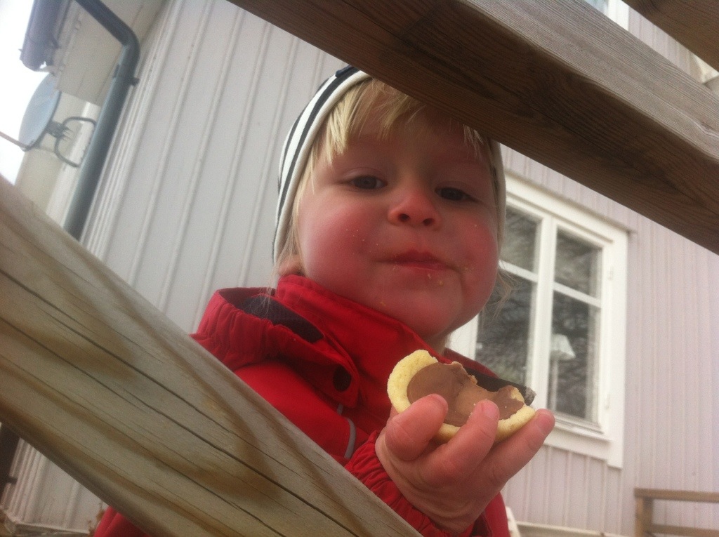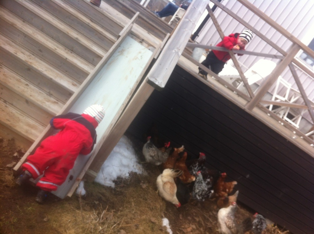 Spjutterum. Alice matar hönorna med kaksmulor.