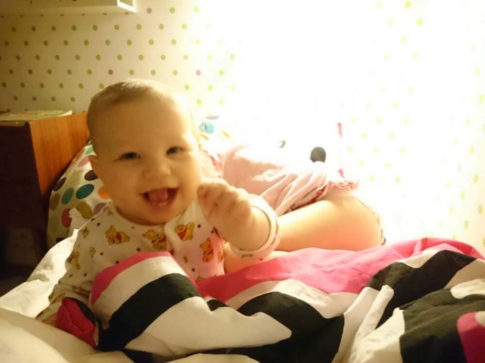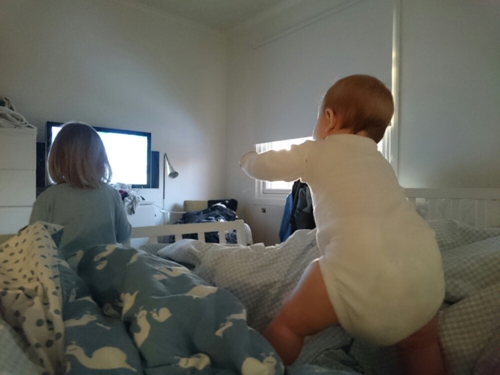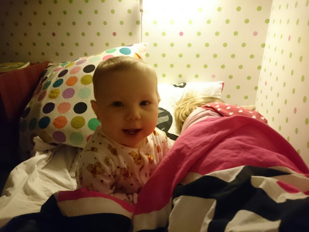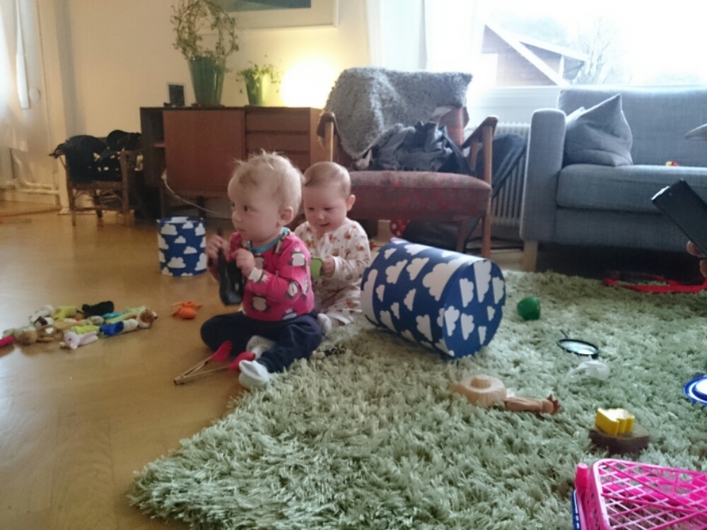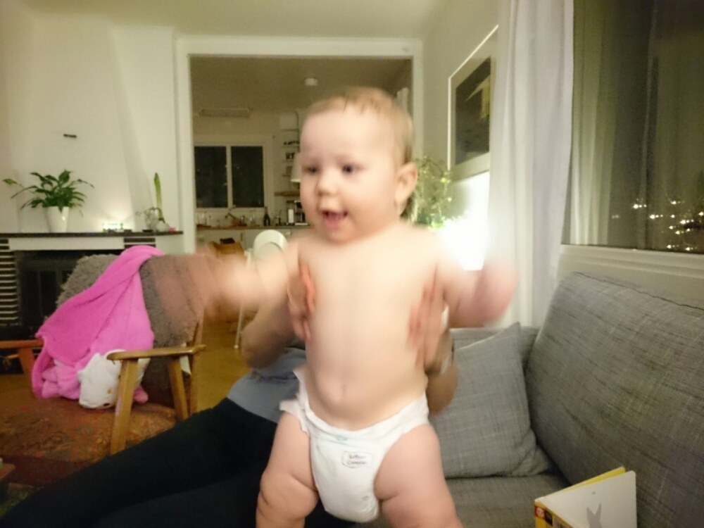 PS. Idag tog Liv tag i mammans ben, när mamman satt på golvet, satte sig på huk, släppte benet – och reste sig upp (alltså utan att hålla i sig)! Sedan stod hon så i några sekunder till mamman började jubla och bröt koncentrationen. Ds.
