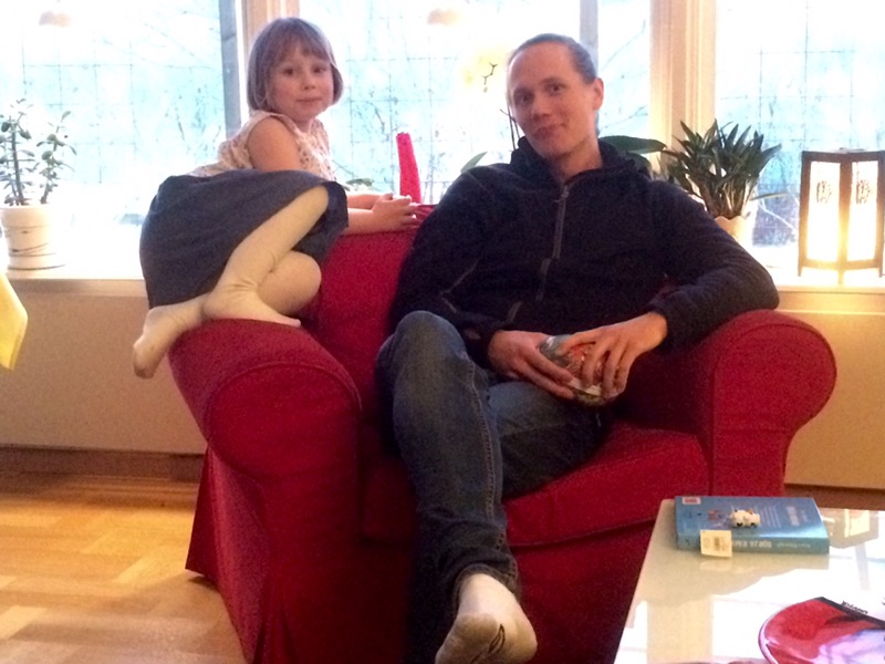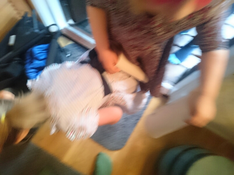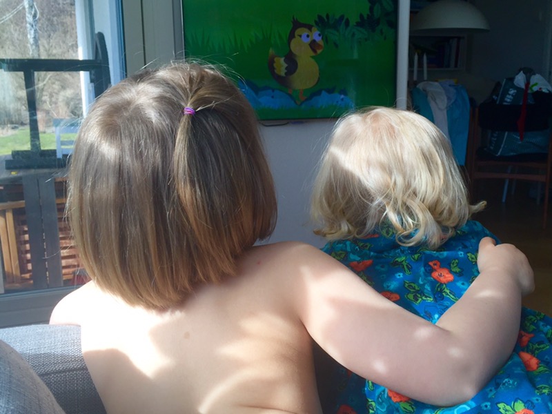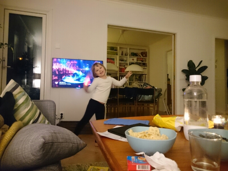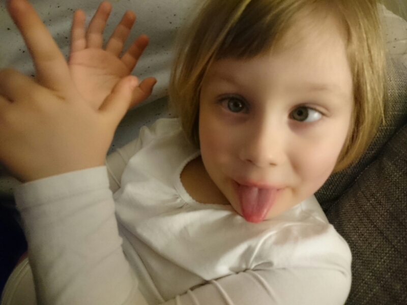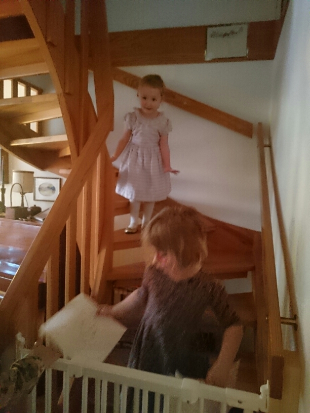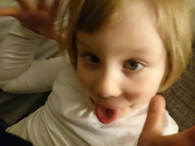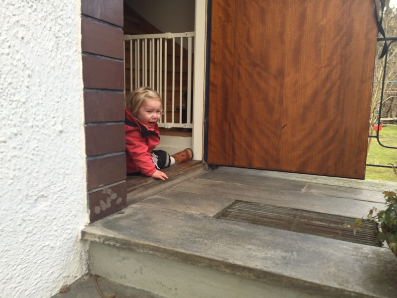 Här är Liv som vilt sparkandes burits in från garaget där något fick henne att bryta ihop och lägga sig raklång på golvet. Hon har redan rullat ut på trappan två gånger men slutade när hon såg att jag inte tittade på henne längre utan på kameran i telefonen. Men arg, det är hon fortfarande. Rosenrasande.