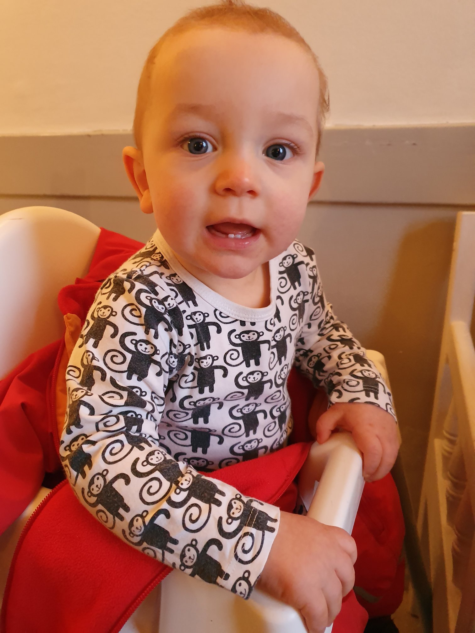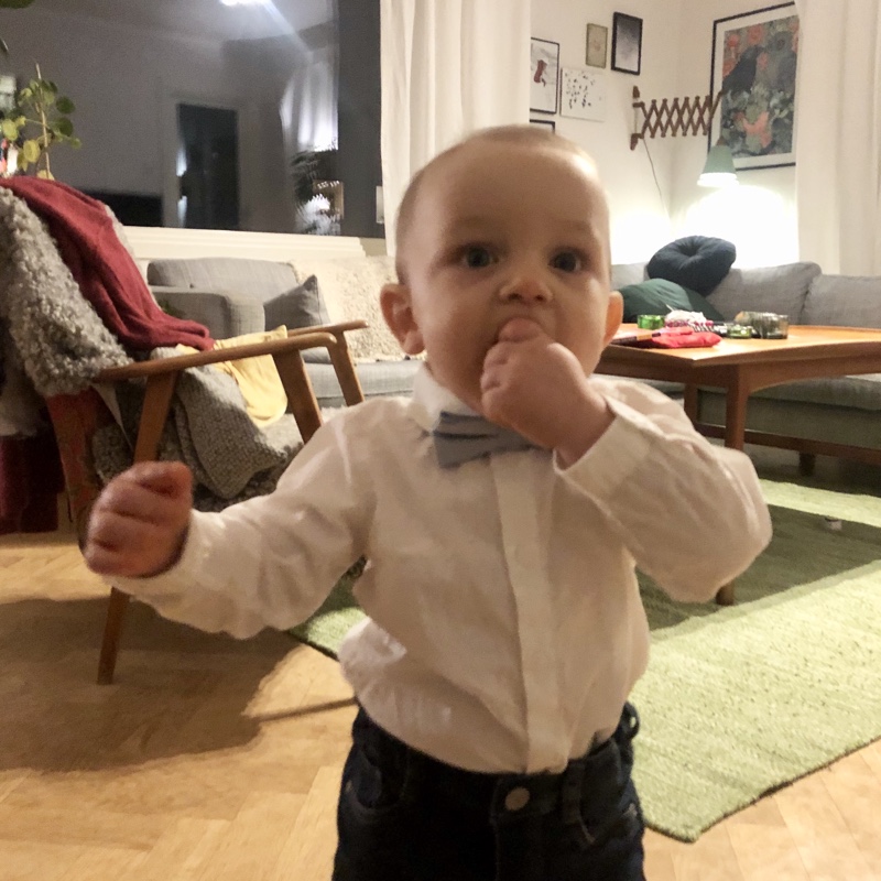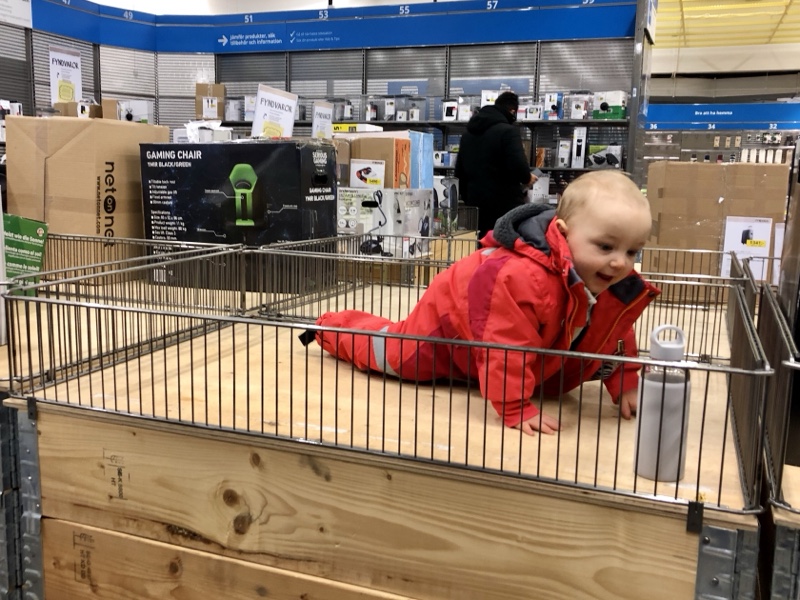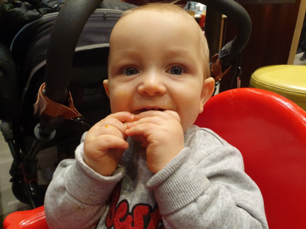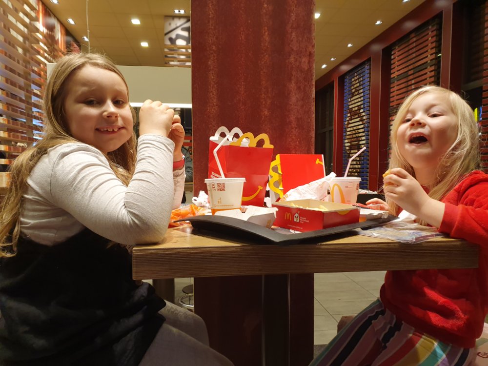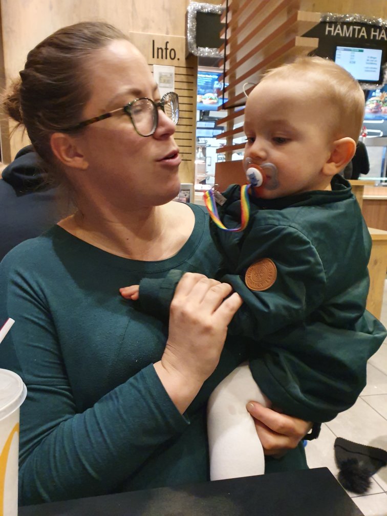 Här är bara sekunder innan Max börjar prestera det mesta han gjort någonsin. Massor av bajs. Löst. Till slut (väldigt snabbt) blev det så mycket att föräldrarna fick sanera både stol och son. De hoppas att de gjorde det diskret men blev nog avslöjade av lukten (och kanske klädbytet)… Tydligen har Max förstört McDonalds för pappan för alltid. Ja ja.