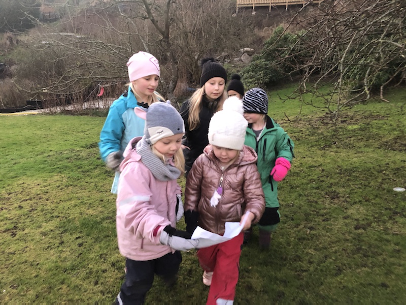 Ebba och Linn ordnade kartor och godisskatt till ”småbarnen” Liv, Kira, Agnes och Freya.